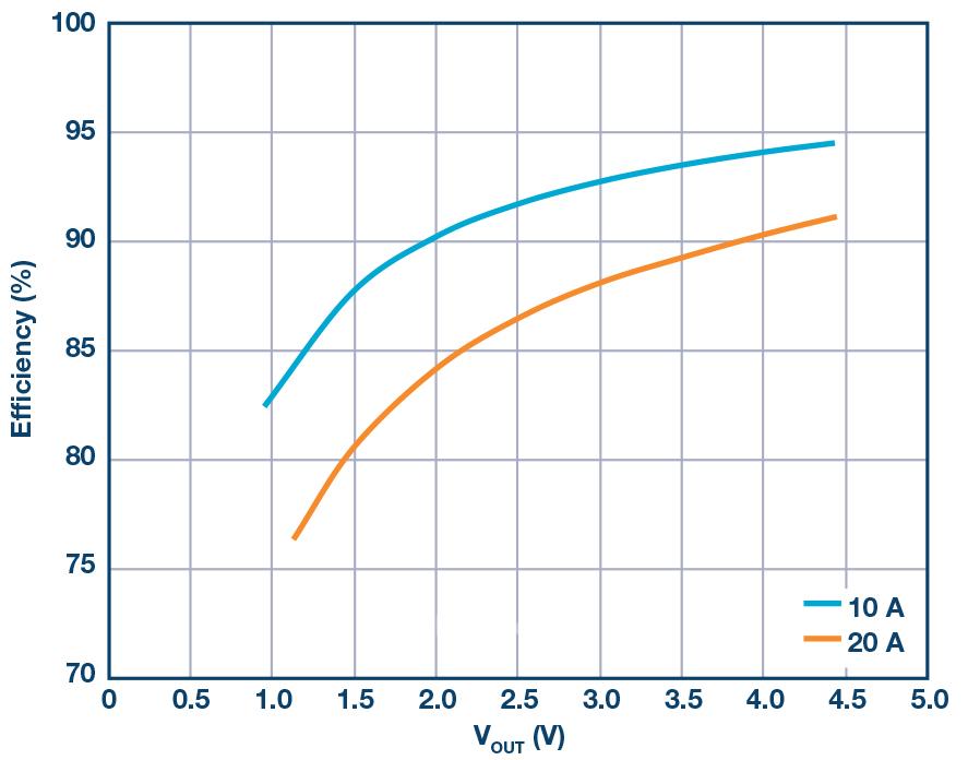 图2显示的是采用ADI最新的集成式硅芯片AD8452构建的单通道系统。这个单芯片解决方案使系统能够轻松配置不同的功率级。AD8452的模拟前端测量并调理环路中的电压和电流信号。它还具有一个内置PWM发生器,可配置为降压或升压模式。模拟控制器和PWM发生器之间的接口由不受抖动影响的低阻抗模拟信号构成;而抖动会使数字环路产生问题。恒流(CC)和恒压(CV)环路的输出决定了PWM发生器的占空比,并通过ADuM7223驱动MOSFET功率级。模式从充电变为放电后,测量电池电流的AD8452内部仪表放大器的极性反转。在CC和CV放大器内部切换可选择正确的补偿网络,并且AD8452将其PWM输出改为升压模式。整个功能通过单引脚利用标准数字逻辑控制。在此方案中,AD7173-8 高分辨率ADC用于监测系统,但它不属于控制环路的一部分。扫描速率与控制环路性能无关,因此在多通道系统中,单个ADC可测量大量通道上的电流和电压。DAC也是如此,因而可以使用低成本DAC(比如AD5689R )来控制多个通道。此外,单个处理器只需设置CV和CC设定点、工作模式和管理功能,因此它能与很多通道实现接口,而不会成为控制环路性能的瓶颈。配置为4 V电池和20 A最大电流的系统可实现高于90%的效率以及超过25°C±10°C时的90 ppm典型精度(电流环路)和51 ppm典型精度(电压环路)。CC至CV的转换是无毛刺的并且时间在500 µs以内。从1 A至20 A的电流斜坡需要的时间不到150 mS。根据具体配置,这个数值可以更小。用户需要做出一些权衡,例如,在斜坡时间和低电流性能之间权衡,以决定所需的斜坡速度。这些规格对于汽车电池制造和测试而言是十分理想的。图3显示了CC放电模式下的效率,以10 A和20 A为例。ADI直接提供完整的测试结果。