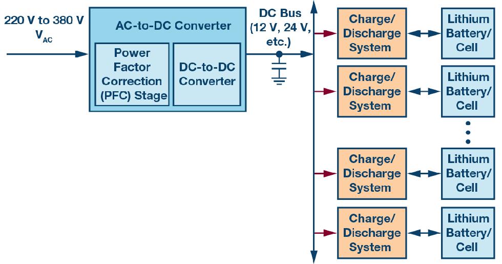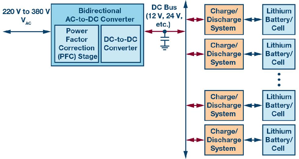 双向AC-DC转换器通过将电能推回交流电网解决了上述难题,如图5所示。在这种情况下,可以先将所有通道设为充电模式,然后设为放电模式,把电流推回电网。这就要求复杂性更高的AC-DC转换器,但在系统配置方面具有更大的灵活性,并且不需要精确平衡充电电流和放电电流,即可确保来自电源的电流为正。