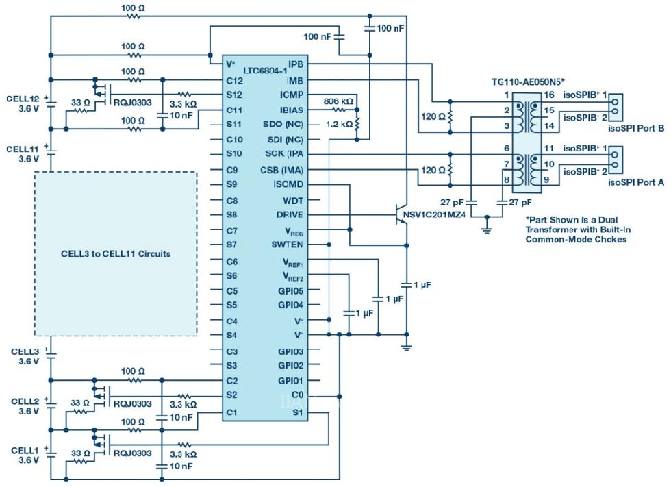 图 2.采用外部被动均衡的 LTC6804 应用电路