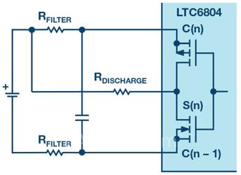 LTC6804 具有内部被动均衡功能 (图 3);如果需要,它还可以配置外部 MOSFET(图 4)。它还具有可选的可编程被动均衡放电计时器,可为用户提供更多的系统配置灵活性。