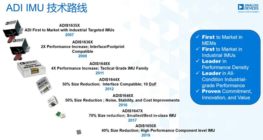 ADI的IMU应用与产品线也非常广泛,自2007年推出了首款IMU产品以来,经过十多年的创新发展,其IMU产品在性能持续提升的同时,尺寸也越来越小。据赵延辉透露,去年11月,ADI推出了最新量产的IMU产品ADIS1650x系列,更注重工业“运动物联网”的需求及其对精准地理定位的需求,其性能能够令系统精确地表征运动,不受湍流、振动、风、温度和其他环境干扰,从而实现更精准的导航和引导。“虽然ADIS1650x体积减小很多,但依然采用了差分结构,实现了非常好的振动抑制特性。”赵延辉强调道:“ADIS1650x系列IMU与其他同类高精度产品相比,拥有5倍宽的动态范围,用以适应极端情况;2倍宽的带宽,用以捕捉急速变化;10倍以上的振动抑制特性改良与10倍以上的低噪声加速度传感器改良。”