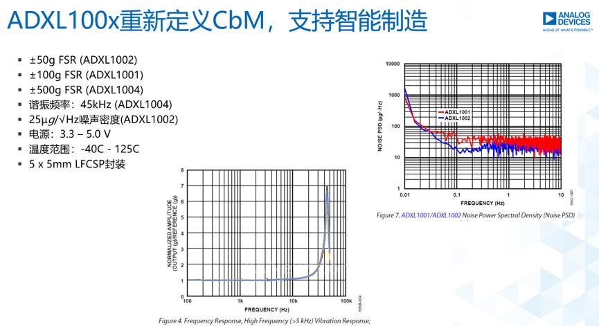 支持结构健康监测的高级特性对于状态监控和结构健康监测,测量范围是一个重要参数。赵延辉举例道:“ADXL100x系列MEMS加速度计可实现高分辨率振动测量,适用于工业条件大多数故障(滑动轴承损坏,不平衡,摩擦,松动,齿轮缺陷,轴承磨损和气蚀)监测应用。这些加速度计的满量程范围为±100g(ADXL1001)、±50g(ADXL1002)和±500g(ADXL1004),在较宽的频率范围内具有25μg/√Hz至125μg/√Hz的超低噪声密度。此外,这些加速度计具有集成的全静电自检(ST)功能和超范围(OR)指示特性,采用3.3V至5.25V单电源供电,功耗低,还有助于无线传感产品的设计。”