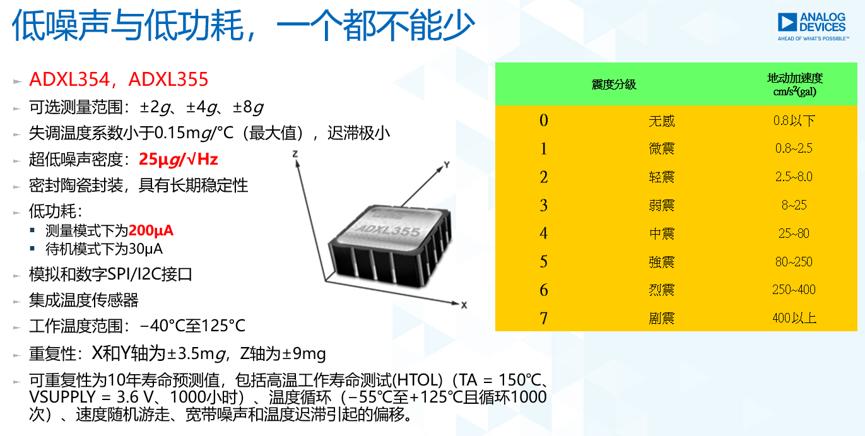 因此,地震预警系统里的MEMS加速度计最重要的两个特性就是低噪声和低功耗。地震有不同的等级,等级越低,振幅越小,要求加速度计必须具备够低的噪声辨识。同时低功耗也很重要,毕竟地震发生的时间不确定,所以必须要MEMS加速度计自铺设开始便一直保持正常工作状态。“如果结合这两个特性,那么ADXL355绝对是市场第一。”赵延辉补充道,“当然,ADI提供的ADXL362比ADXL355功耗低很多,但它的噪声也很高,就仅适用于5级以上的地震,因为噪声主要分辨地震的强度,而功耗则决定了产品的监测时间。”