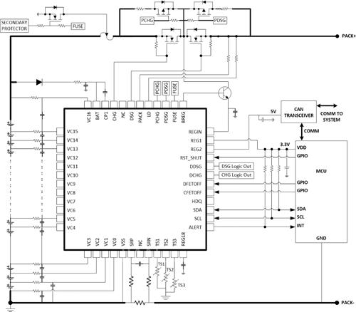 图2显示了基于BQ76952的16s电池组的简化原理图,使用I2C与主微控制器通信。集成调节器为微控制器和可选的外部收发器提供电源轨。