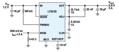 LT3033的输入电压范围是1.14 V至10 V, 输出电压可低至0.2 V,负载电流可达3 A。在满负载时的压差仅95 mV。工作时静态电流为1.8 mA,关断时降至22μA。可由用户设定的限流功能和热保护使其具有高电流、低电压应用所必需的鲁棒性。