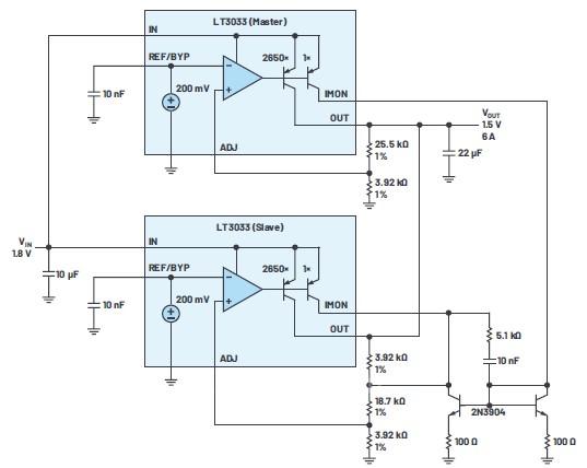 对于需要3 A以上电流的应用,可以利用其电流监测功能将多个LT3033并联。图3显示两个LT3033以及两个2N3904 NPN器件通过并联,以产生1.5 V、6 A输出。每个器件的IN引脚和OUT引脚分别相连。一个LT3033充当主器件,控制另一个LT3033从器件。