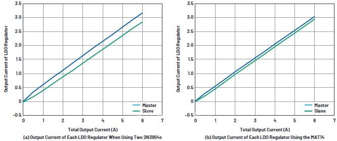 图4比较了使用分立式和匹配的NPN器件时每个LDO稳压器的相应输出电流。与2N3904相比,MAT14电流镜的电流失配率从5.3%降至1.6%。
