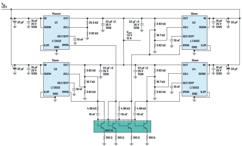 图4.通过使用匹配的MAT14单芯片四通道三极管和并联LDO稳压器,降低了均流失配。