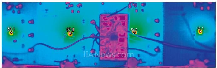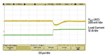 通过扩展电流镜和添加LT3033从器件,该并行电路架构可根据需要扩展,使用更多LT3033。图5显示使用MAT14、四个LT3033并联的均流解决方案。热性能如图6所示。四个LT3033的温度在51°C至58°C范围内。考虑每个器件沿输入走线的压降,电路板上散热均匀,表明该解决方案实现了平衡均流。图7显示在1.8 V输入下运行提供1.5 V输出、12 A电源的瞬态响应。