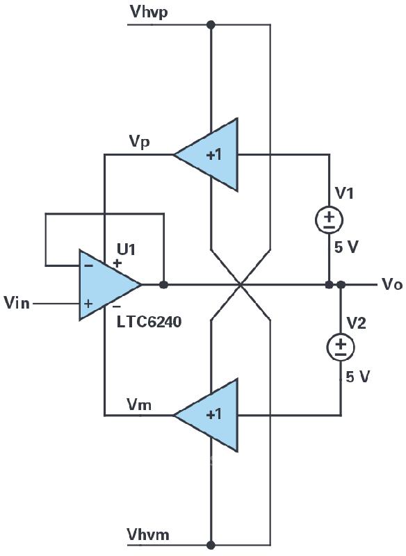 LTC6240由Vp(通过增益为+1的缓冲放大器保持输出加5 V的值)和Vm(由另一个缓冲器驱动而保持输出减5 V的值)供电。