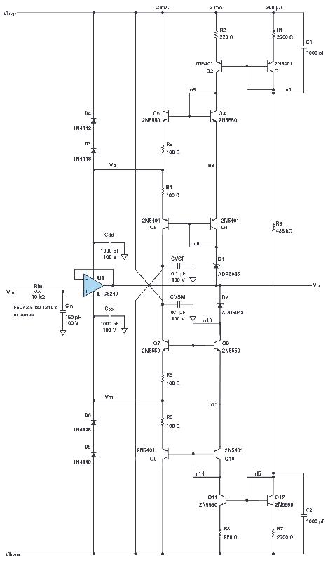 Q7至Q12形成与之前所述相当的Vm减电源驱动器。请注意齐纳电压的不匹配是有意为之的:Vp比输入/输出高5V,Vm比输入/输出低3 V。这种不匹配使输入电压的中点位于LTC6240的电源限制输入范围以内,从而优化压摆波形。