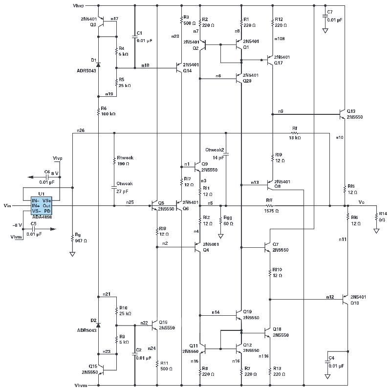CFA的正输入为节点n25,负输入为n5(是的,这是输入)。Rff和Rgg本身将内部CFA的增益设置为约27。这种高增益可以将运算放大器输出摆幅控制在±2 V。CFA可以设置为更高增益以进一步减轻控制放大器的负担,但如此一来,CFA将损失带宽,并且失真增加。总增益由Rf和Rg设置为20。Ctweak和Ctweak2配合Rf工作,从215 kHz以上的运算放大器整体反馈中消除CFA的相位滞后,从而增强运算放大器的稳定性。