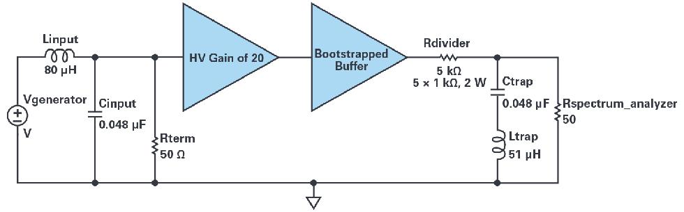 发生器通过一个低通滤波器(Linput和Cinput)驱动Rterm,滤波器衰减发生器的100 kHz谐波。失真由此改善到-113 dBc,低于要测量的电路。净化后的信号由高压放大器提升,并由缓冲器传递,缓冲器驱动分压器。