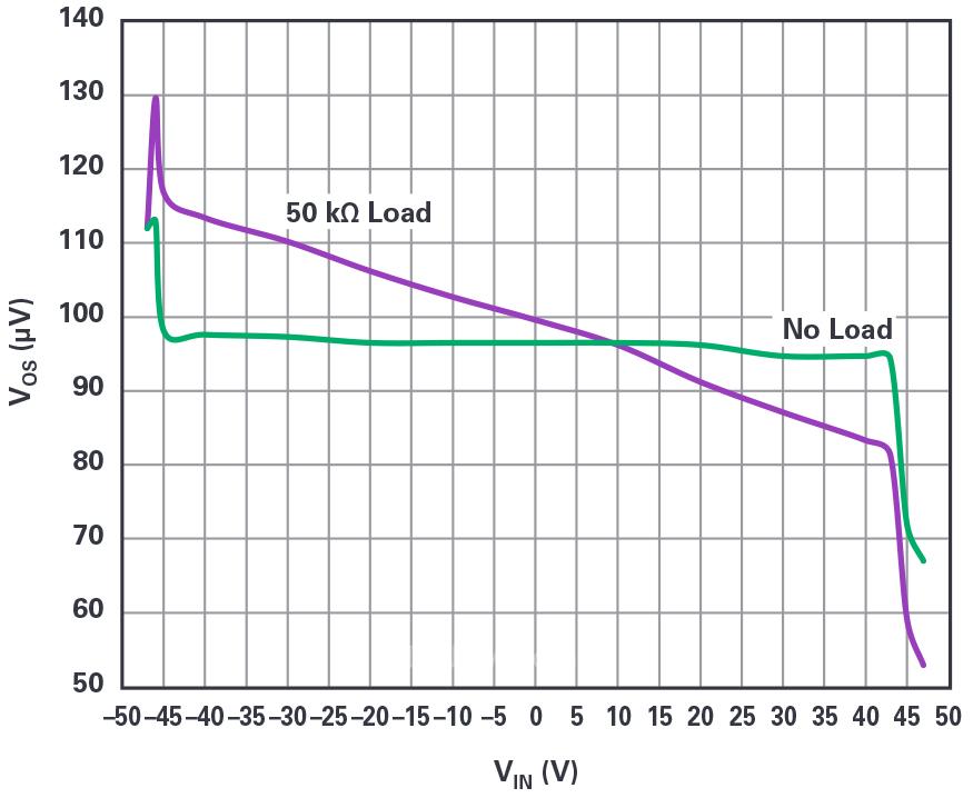 图6.缓冲器的VOS与VIN的关系。Rl = 50 kΩ和∞