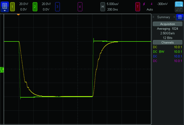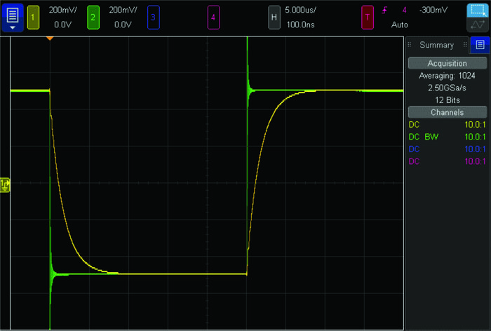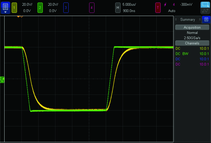 对绿色通道中的振铃我要表示道歉,这是高压放大器的输出。它不是自行振铃的,原因只是我使用的示波器探针和板对板接地很一般。黄色通道是缓冲器输出,它是由Cin + Rin主导的简单指数图像。