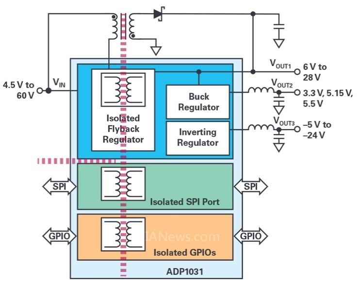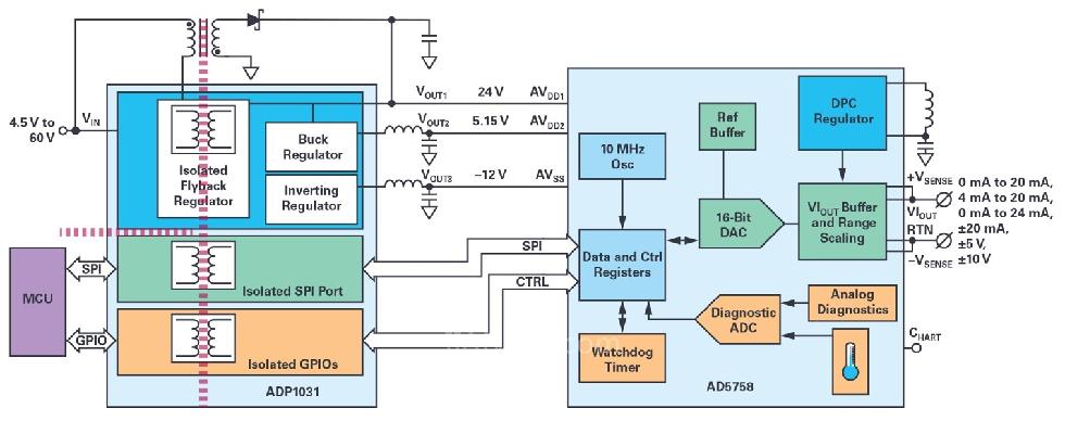 ADP1031解决了隔离和尺寸问题,提供300 V基础的电源和数据隔离,AD5758则提供低功耗、高精度,可配置的电流或电压输出通道。