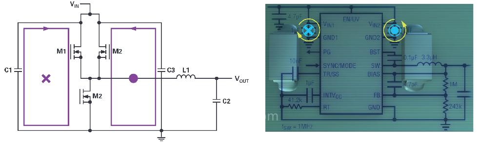 虽然不可能完全消除热回路区域,但是我们可以将热回路分成极性相反的两个回路。这可以有效地形成局部磁场,这些磁场在距IC任意位置都可以有效地相互抵消。这就是Silent Switcher稳压器背后的概念。