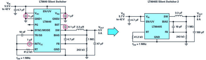 图7.Silent Switcher应用与Silent Switcher 2应用框图。
