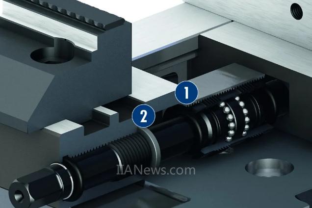 KSC 虎钳密封性好,采用双重密封(如图所示:1-轴承密封;2-驱动螺杆密封),中心采用双面轴承定心,操作轻便,定心精度极高(±0.01 mm)。