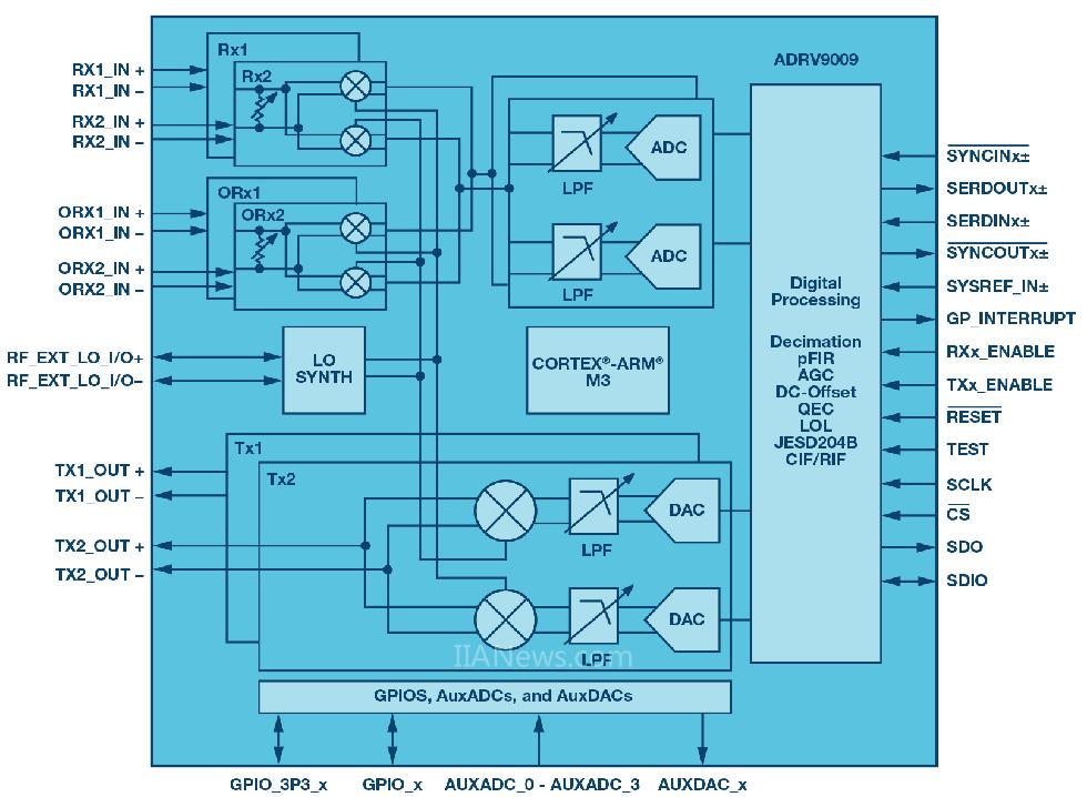 图1.ADRV9009是将多种功能集成到单个IC中的集成式收发器示例。