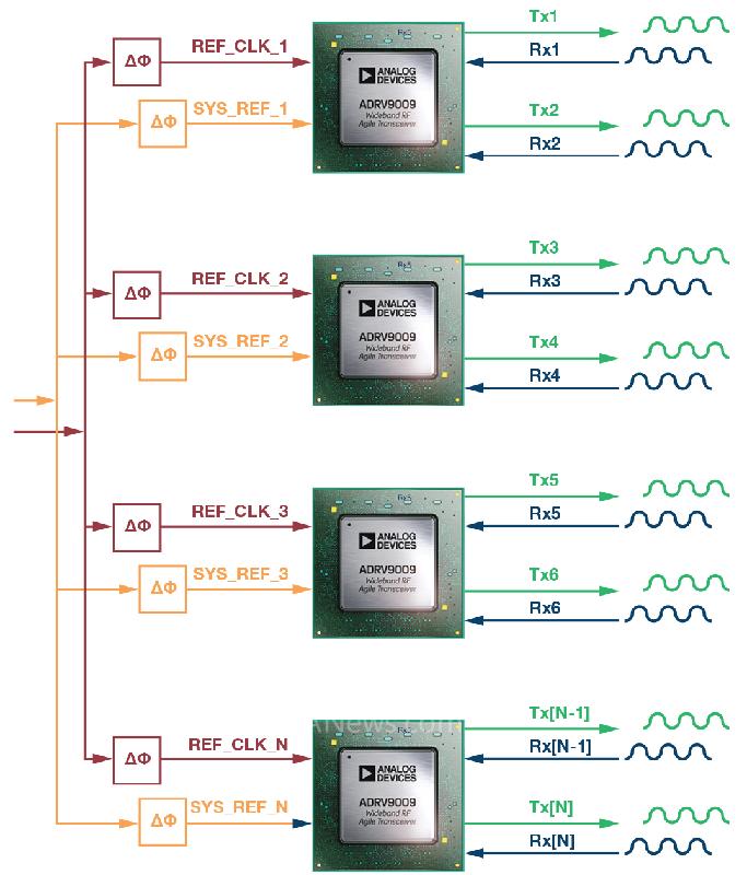 如果系统需要两个以上接收器和两个发射器,用户仍然能使用多个集成式收发器,从因为单芯片接收和发射通道实现的小尺寸中获益。该技术的示例如图3所示。可以通过使用并发型SYS_REF脉冲来同时触发所有IC的内部分压器,从而同步多个集成式收发器。这些SYS_REF脉冲可由时钟芯片或基带处理器发出,附带可编程延迟,该延迟是造成各IC之间的路径长度不匹配的原因。跨多个芯片的数据路径和多个LO都可以是确定性的。