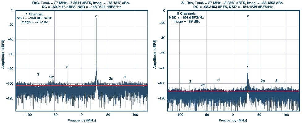 图4.使用ADRV9009集成式收发器来集成接收通道可以降低噪声谱密度,并改善动态范围。