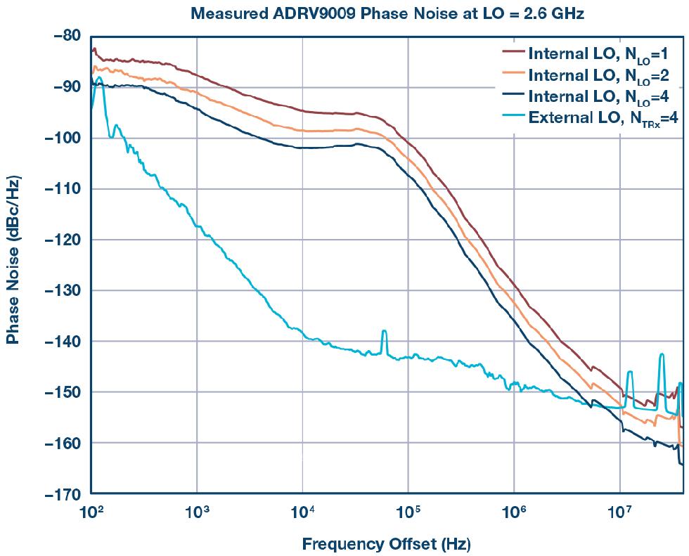 图5.使用内部LO时,集成多个ADRV9009的发射通道可以改善系统级相位噪声性能。