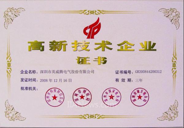 2008年 搬迁至英威腾高发科技产业园;获得“国家级高新技术企业认证”