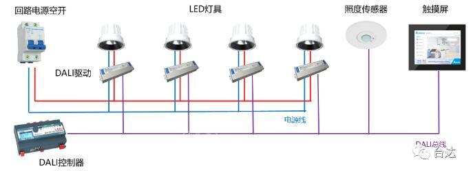 DALI智能照明可实现每盏灯具的调光,同时可以实现任意组合区域的灯具控制,后期可以自由组合回路,不需要更改现场硬件。向上可通过OPC、BACnet/IP、LON-IP852等网络协议直接接入上层监控网络或者第三方平台实现整合。采用这种方式可使得照明控制架构更为简洁,且数字信号不易受干扰,DALI信号不分极性,可以与强电共管,施工布线更加方便。