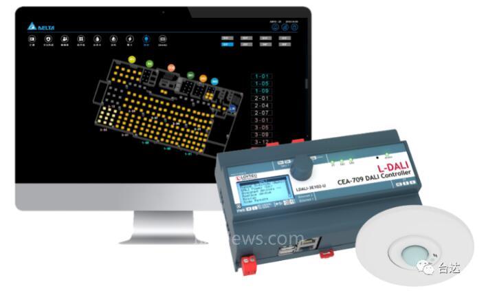 通过引入台达LOYTEC的DALI数字可调光智能照明技术,工厂的照明管理更加便捷,通过上位机照明控制系统软件平台,可以实现定时控制、场景控制和自动感应控制,如图所示为台达DALI控制器以及上位机呈现的软件监控画面。为了便于控制,本地各个区域的入口处均安装了多功能控制面板,大空间的车间或者办公空间则安装嵌入式触控屏。结合现场使用需求,对现场触控屏和本地面板进行设置,通过设定后可在多功能面板上实现对照明灯具的开光、调光以及场景的切换控制。而在本地触控屏幕上,除了开光、调光和场景切换外,还能具备排程设定、密码保护等高阶功能。