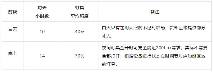 根据设计规范要求,每平方的光照度达到200Lux即可完成满足生产作业需要。因此,原设计中的灯具完成满足规范要求,且部分区域远超过规范要求,属于可优化能耗部分。下表所示为实际使用场景分析:
