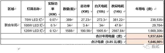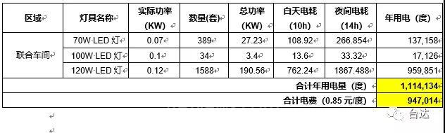 经过计算,现场能耗使用大大降低,以一个车间为例,现场使用的灯具参数如下表所示: