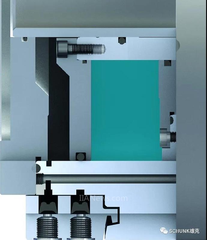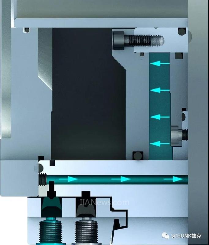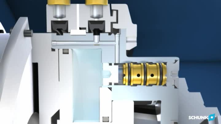 雄克ROTA TP气动卡盘内部集成了驱动气缸和保压功能。在不适合使用液压系统的机床或自动化产线上,只需要通过配气环供气,即可实现工件自定心夹紧。配气环断气后,卡盘双向保压阀可保持卡盘气缸内压力,确保加工过程中卡盘夹持力稳定可靠。