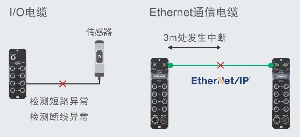 诊断I/O、通信电缆的状态:“检测I/O电缆的断线、短路异常,以及Ethernet通信电缆发生断线、短路时,可告知大致的异常部位。”