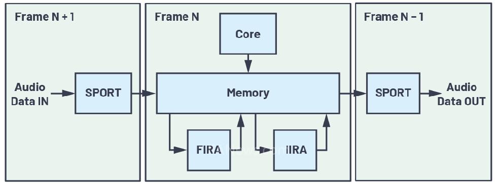 •如图3所示,内核处理第N个帧,然后启动加速器对该帧进行处理。内核随后继续进一步并行处理加速器在上一迭代中产生的第N-1帧的输出。该序列允许将FIR和/或IIR处理任务完全转移给加速器,但输出会有一些延迟。