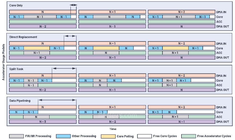 如前所述,根据应用的不同,可能需要以不同的方式使用加速器,以最大限度分担FIR和/或IIR处理任务,并尽可能节省内核周期以用于其他操作。从高层次角度来看,加速器使用模型可分为三类:直接替代、拆分任务和数据流水线。