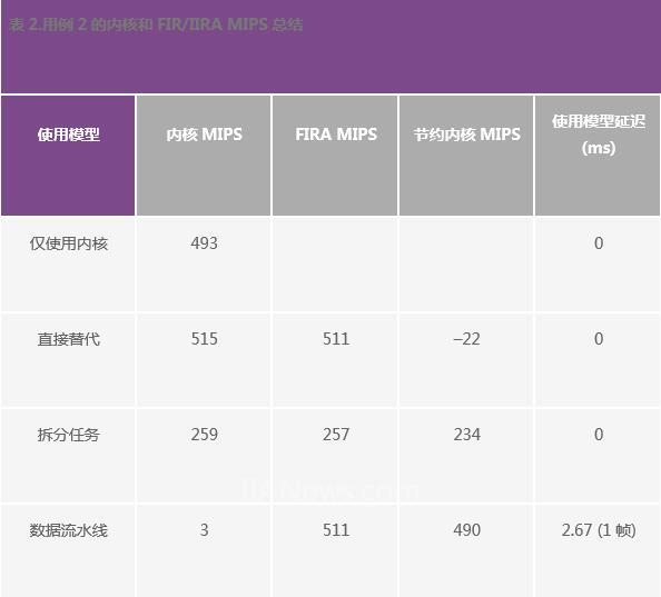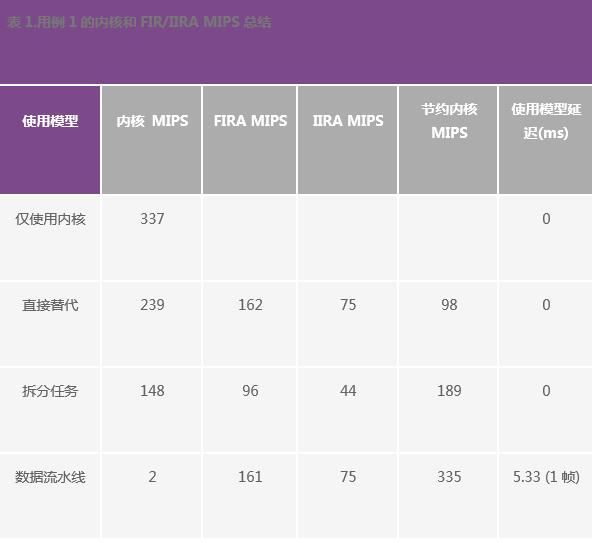 表1显示测得的内核和FIRA MIPS数量,以及与仅使用内核模型相比获得的节约内核MIPS结果。表中还显示了相应使用模型增加的额外输出延迟。正如我们所看到的,使用加速器配合数据流水线使用模型,可节约高达335内核MIPS,但导致1块(5.33 ms)的输出延迟。直接替代和拆分任务使用模型也分别可节约98 MIPS和189 MIPS,而且未导致任何额外的输出延迟。