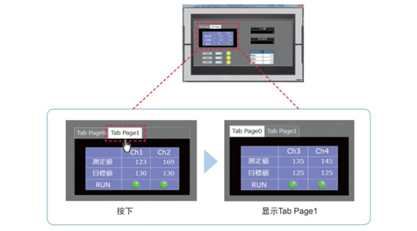 画面中的一部分可以像记事本一样使用。标签控制最多可达64个标签,1个画面中最多可配置10个。无需切换画面,切换标签即可轻松进行各种数据的监视、变更。