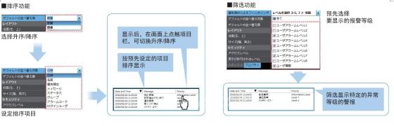 可按预先设定的项目“排序”,或按任意关键字“筛选”。可立即从发生的多个警报中确定要查看的异常位置。