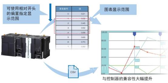 可以折线图的形式显示控制器的变量及多维数组的信息。也可使用子程序(Visual Basic),以折线图的形式显示NJ/NX/NY的SD卡中的CSV文件。对于运动动作的日志结果等大型数组数据,也可使用相对开头的偏置来指定显示范围。