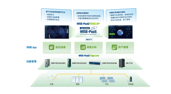两者的有机结合突破了网络的地理局限性,借助全息感知、互联互通技术,成为调节智能电网对风光能源发电兼容量的有效抓手。这也是研华构建风光储新能源平台解决方案的意义所在。研华风光储新能源平台,涵盖了感知层、平台层、应用层,一方面可帮助客户突破物理层、信息层和价值层之间的屏障,实现能量流、信息流和价值流的高度融合,另一方面打破了源- 网- 荷各环节条块分割的壁垒,实现协同优化。目前研华已在风力发电、数字化核电站、光伏电站、储能系统等领域都形成了智能监控运维平台解决方案。