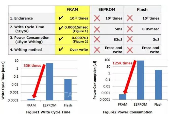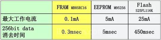 FRAM、EEPROM、FLASH工作电流与消去时间对比