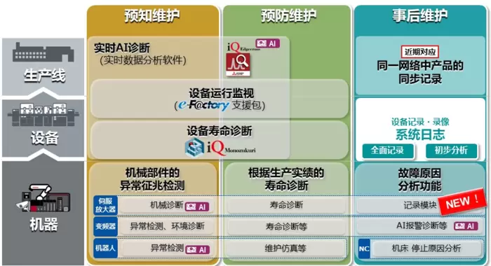 三菱电机将制造业现场机器、设备、产线及生产工艺中的各种客观存在的数据进行收集并管理,通过【预知维护】【预防维护】,以及可实现迅速复产的【事后维护】,对工厂整体的“停机时间缩短”“生产效率提高”以及“品质改善”做出贡献。