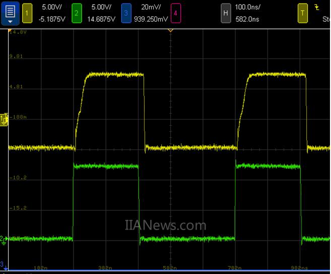 例如,在典型的分立式FET降压稳压器中,通过外部栅极电阻、升压电阻或缓冲器来降低开关边沿的速度,以减少EMI,这也是符合汽车工业严格的辐射排放标准的最后一种解救方法。这样快速解决EMI问题均以损失性能为代价;例如效率降低、组件数目增多,解决方案尺寸加大。开关边沿速度慢则会增加开关损耗和占空比损失。转换器必须在较低的频率下工作(例如,400 kHz)才能获得令人满意的效率,并通过强制性电磁辐射EMI测试。图1显示了分别具有快开关边沿和慢开关边沿的典型开关节点电压波形。如图所示,开关边沿速度明显变慢,导致开关损耗增加,最小占空比或降压比显著增加,更不用说对性能产生的其他负面影响。