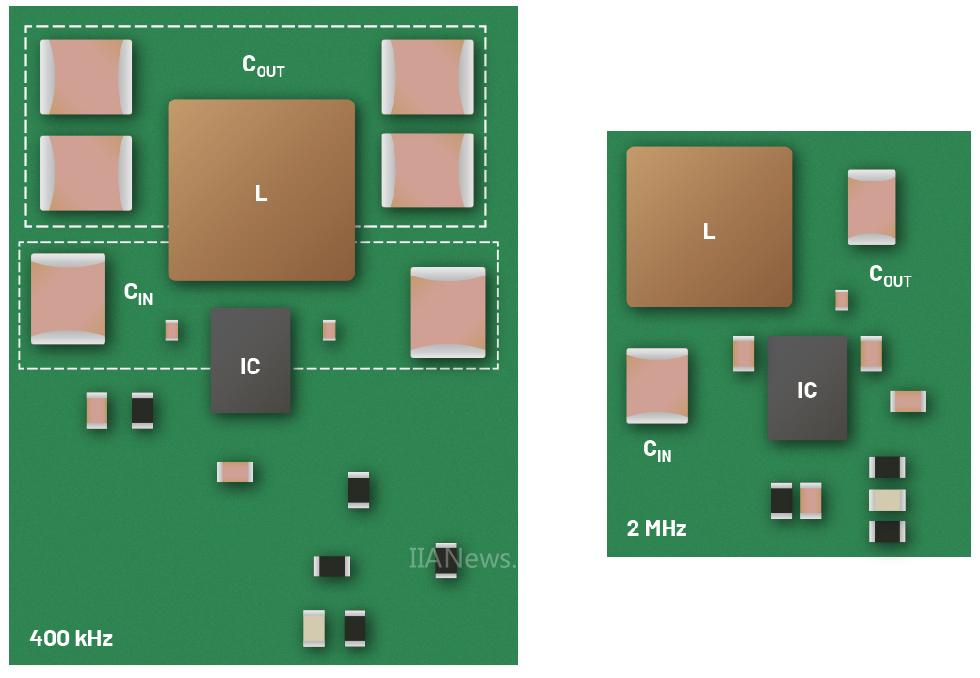 图2.2 MHz解决方案与400 kHz解决方案尺寸对比。