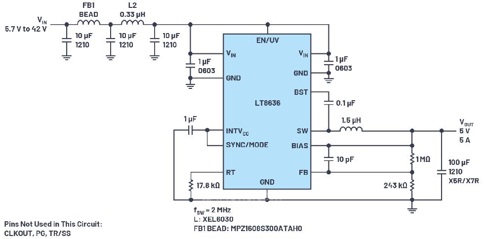 图3.展频模式下的超低EMI LT8636 5 V/5 A降压转换器,峰值电流为7 A,工作电压5.7 V至42 V。