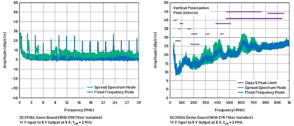 从传导EMI频谱可以明显看出,峰值谐波能量被分散开来,从而降低了任何特定频率的峰值幅度—由于扩频功能,噪声至少减少了20 dBμV/m。从辐射EMI频谱也可以明显看出,展频模式也可以减少辐射EMI。该电路符合严苛的汽车级CISPR 25 Class 5辐射EMI要求,仅需在输入侧使用简单的EMI滤波器。