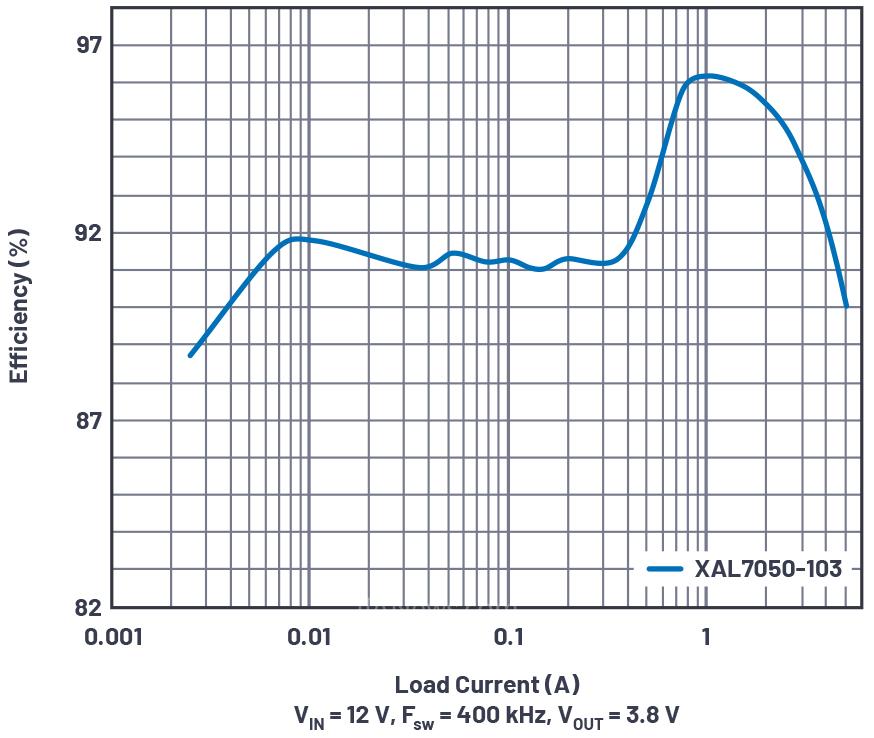 图5.采用XAL7050-103电感的12 V至3.8 V/5 A解决方案的效率(fSW = 400 kHz)。