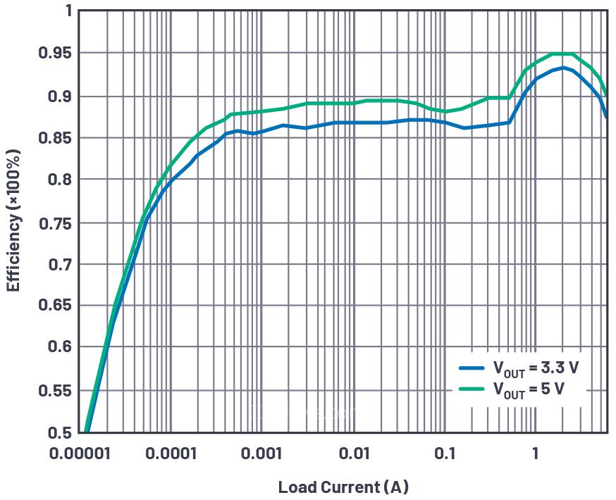 为了提高轻载效率,可选用更大值的电感,因为在短脉冲期间可向输出传递更多能量,降压稳压器也可在每个脉冲之间的休眠模式下保持更长时间。通过尽可能延长脉冲之间的时间,尽量减少每个短脉冲的开关损耗,单片式降压转换器静态电流可在单片式稳压器(如LT8636)中达到2.5 μA。而市场上的典型部件为几十甚至几百μA。