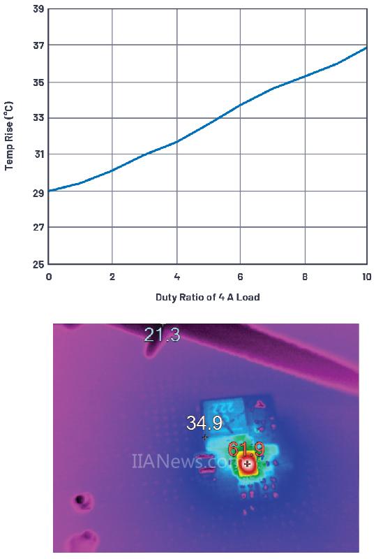 图7.3 mm × 4 mm LT8636在13.5 V至5 V/4 A恒定负载加4 A脉冲负载(10%占空比)下的热图显示温度上升。